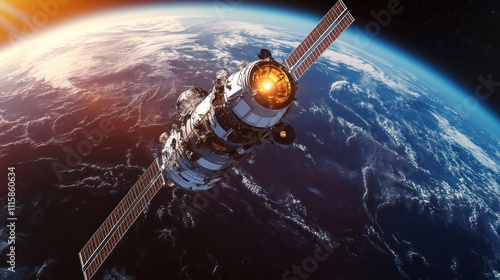 Obraz premium Spacecraft orbiting Earth during sunrise.