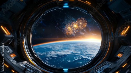 Obraz premium Spacecraft Window View of Earth with Fireworks