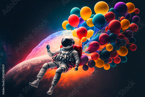Fototapeta premium Spaceman flying with colorful balloons. ilustration, background, wallpaper, generative ai