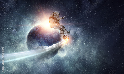 © Sergey Nivens, Obraz premium Spaceman on flying board. Mixed media