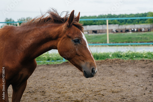 © Andrii, Naklejka premium Spacer po ranczo na pięknym i zdrowym koniu. Hodowla zwierząt i hodowla koni