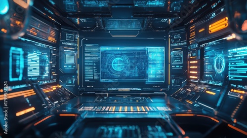 Obraz premium Spaceship cockpit interior displaying advanced holographic data interface