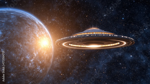 © siraphol, Obraz premium Spaceship glides through space near giant gas planet, illuminated by distant sun