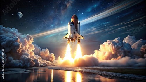 © suchetpong, Obraz premium Spaceship launch at night with smoke cloud