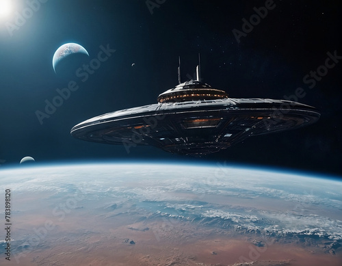 Obraz premium spaceship orbiting a distant planet