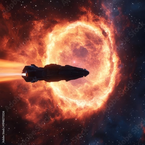 © Kankamol Tama, Obraz premium Spaceship passing through a nebula filled with glowing energy, plasma storms raging around, sci-fi exploration simulation
