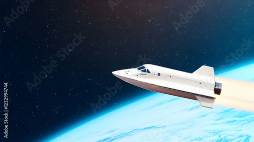 Fototapeta premium Spaceship soaring above Earth's atmosphere.