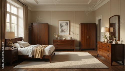 Naklejka premium Spacious and Elegant Bedroom Interior Featuring Wooden Furniture and Natural Light