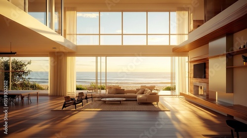 Fototapeta premium Spacious beach house with warm light pouring in, subtle earthy tones, large windows overlooking the ocean, serene golden hour ambiance