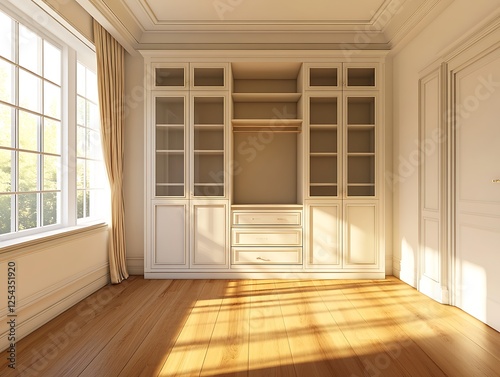 © ShadowHero, Obraz premium spacious bedroom with wardrobe and warm wooden floors