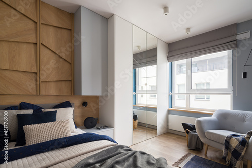Fototapeta premium Spacious bedroom with window, wardrobe and armchair