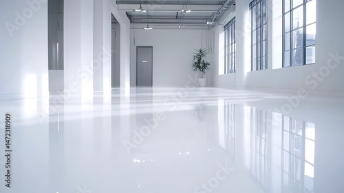 Fototapeta premium Spacious bright indoor space with mirror-like floor reflecting natural light...