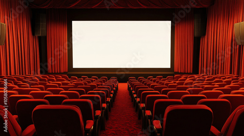 Fototapeta premium spacious cinema hall featuring red velvet seats and large blank projection screen, creating inviting atmosphere for moviegoers