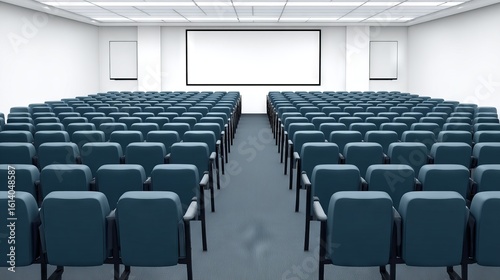© Mary_muis/stoker ua, Fototapeta premium Spacious conference room featuring rows of teal chairs arranged for an audience, with a large blank screen at the front, ideal for presentations and gatherings