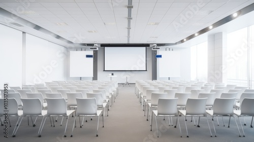Fototapeta premium Spacious conference room with immaculate rows of white chairs, poised for a...