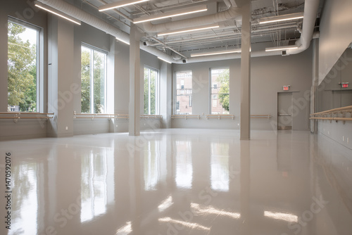 © PhotoArtHub, Fototapeta premium Spacious dance studio with polished floor, large windows, and ballet barres, showcasing bright, airy ambiance ideal for dance classes or rehearsals