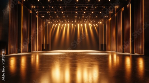 © Aisha, Fototapeta premium Spacious, empty concert stage with golden highlights on sleek black surfaces, modern aesthetic, no instruments or performers