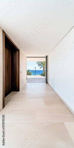 © JuanM, Obraz premium Spacious hallway leading to a coastal view with palm trees on a bright sunny day