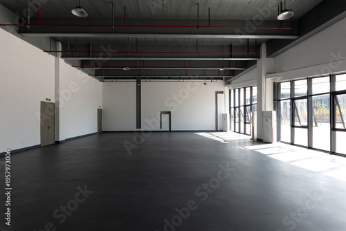 © zhu difeng, Obraz premium Spacious industrial-style factory interior with exposed ceiling pipes and natural light