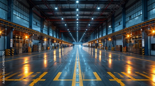 Fototapeta premium Spacious industrial warehouse with bright overhead lights and clear...