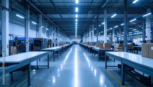© Kitta Studio, Fototapeta premium Spacious Industrial Warehouse with Rows of Tables and Boxes
