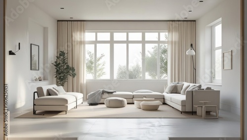 Fototapeta premium Spacious, light-filled living room with minimalist furniture.