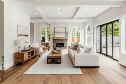 Fototapeta premium Spacious living room with modern furniture, natural light, and a white wall...