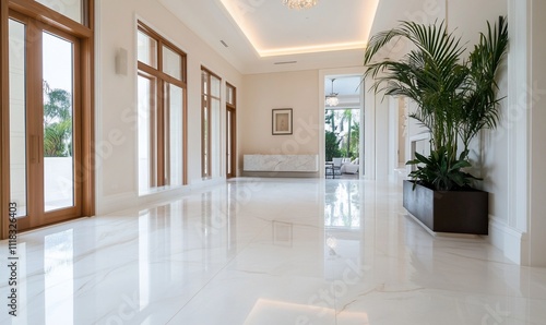 Fototapeta premium Spacious modern hallway with elegant marble flooring and greenery.