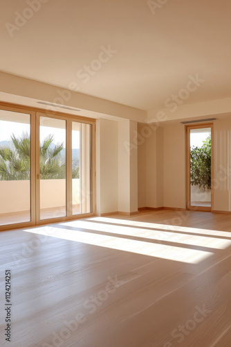 Obraz premium Spacious modern interior with large windows and natural light in open layout...