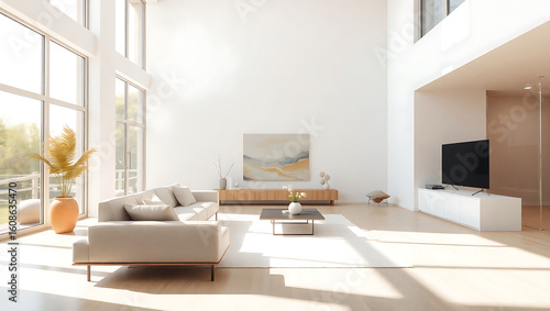 Fototapeta premium Spacious modern living room with high ceilings and natural light