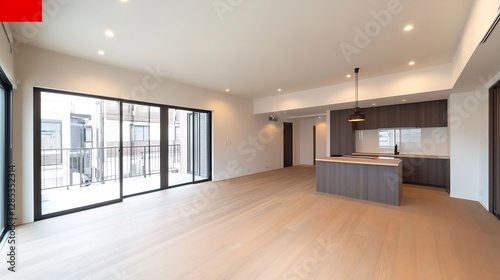 Fototapeta premium Spacious Modern Living Room with Natural Light and Open Kitchen Design :...