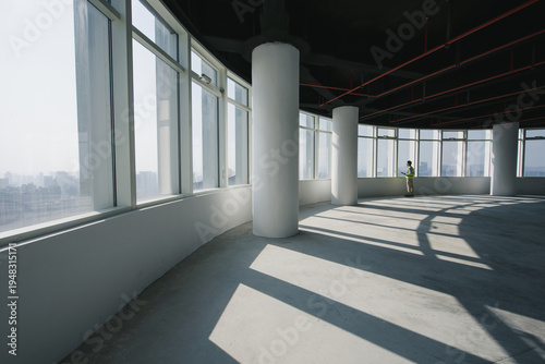 © zhu difeng, Obraz premium Spacious office interior with abundant natural light and structural columns in an unfinished high-rise building