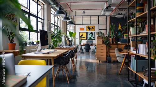 Naklejka premium Spacious open-plan office with large windows, natural light, ergonomic desks,...