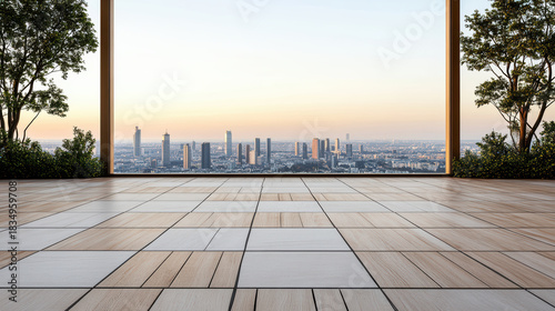 Fototapeta premium Spacious rooftop terrace with wood tile floor and city skyline at dusk,...