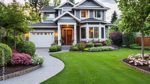 Naklejka premium Spacious suburban home with a perfectly maintained lawn, flowering bushes,...