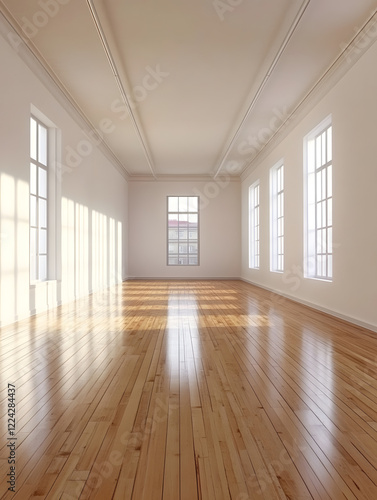 Fototapeta premium Spacious Sunlit Empty Room with Polished Hardwood Floors and Tall Windows :...