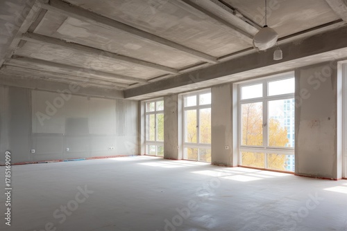 © Letitia, Obraz premium Spacious unfinished interior with large windows.