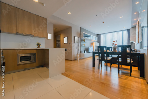 © Tracy Ben, Fototapeta premium Spacious white and wooden living room with modern