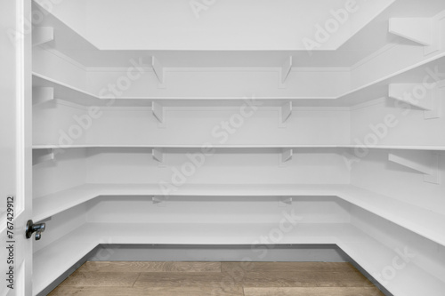 Obraz premium Spacious white pantry with empty shelves