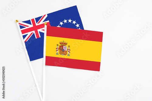 Naklejka premium Spain and Cook Islands stick flags on white background. High quality fabric, miniature national flag. Peaceful global concept.White floor for copy space.