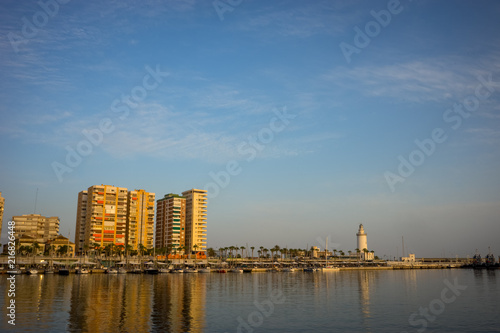 © SkandaRamana, Naklejka premium Spain, Malaga, a light house at the quay bay area