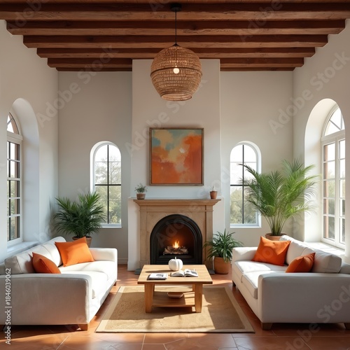 © Vadym, Naklejka premium Spanish colonial style living room features white sofas, fireplace, wooden beams, arched windows. Vibrant orange pillows add pop of color to elegant space. Natural light fills room, warm decor,