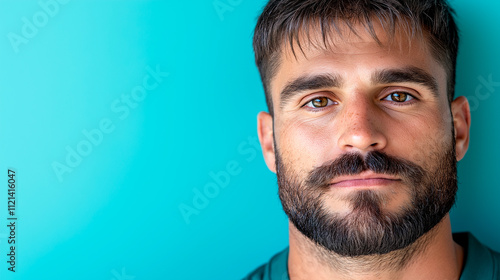 © El So, Obraz premium Spanish man, young, with beard, posing for the camera on pastel blue studio background.