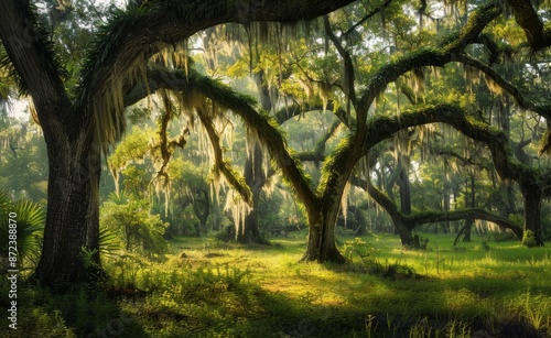 Naklejka premium Spanish moss draped over a massive Live oak tree in South Carolina's low country