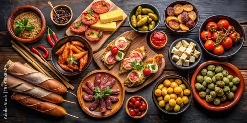 © Collection, Fototapeta premium Spanish tapas selection on black background with space for text