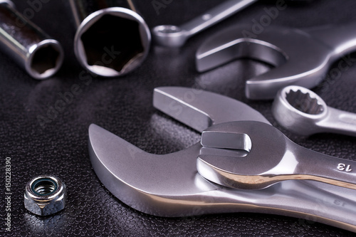 Fototapeta premium Spanners of various sizes, on dark abstract background.