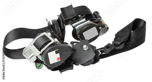 Obraz premium Spare part and interior element black seat belt from a car on a white isolated background. Auto service industry.