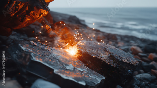© Velem, Fototapeta premium Sparkler Ignition on Rocky Shore