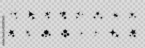 Naklejka premium Sparkles, stars and bursts icons, twinkling stars. Vector set of different black sparkles icons on transparent background.
