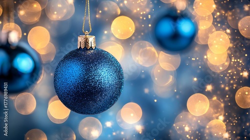 Fototapeta premium Sparkling blue Christmas ornaments shimmer against a magical bokeh background of warm golden lights creating a festive and elegant holiday celebration atmosphere.
